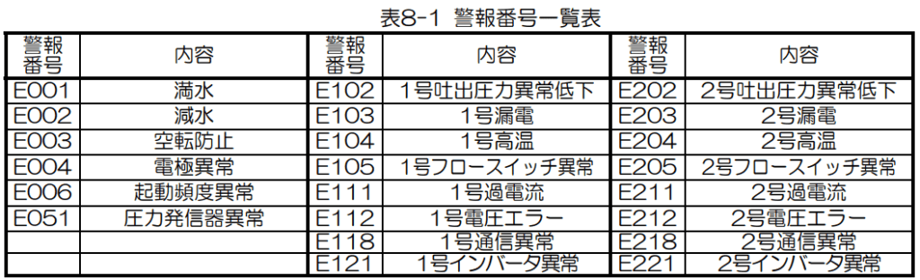 そんなときは、操作盤に表示された番号をメモし、取扱説明書の「警報番号一覧表」で内容を確認しましょう。