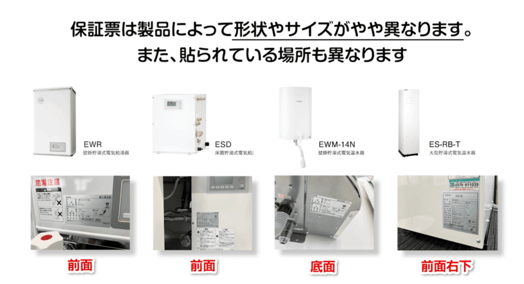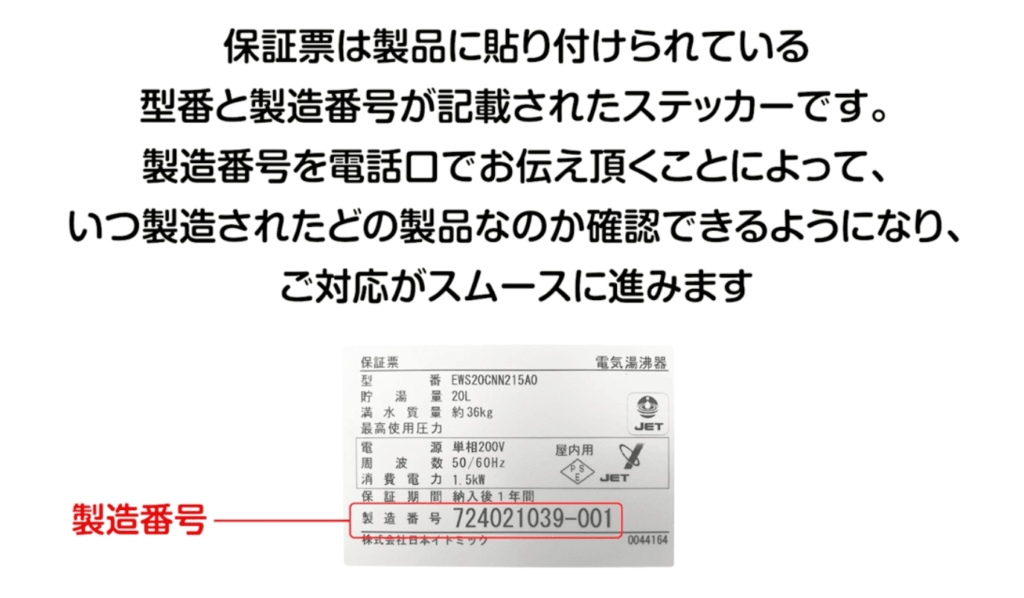 日本イトミックの電気温水器の製造番号は保証票の下部に記載されています。