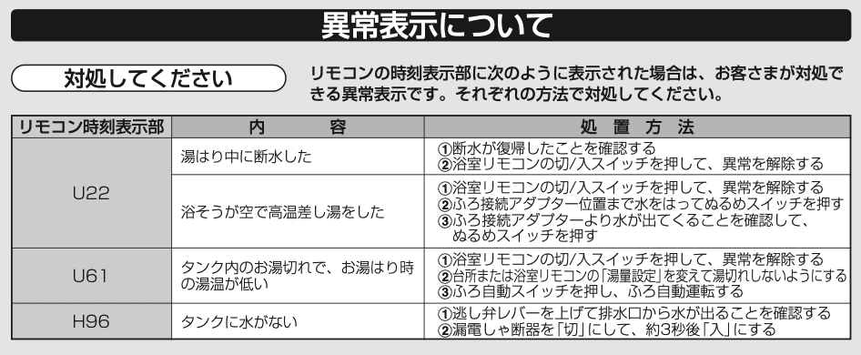 通常、U61は「お湯切れ」を伝えるもので、故障ではありません。