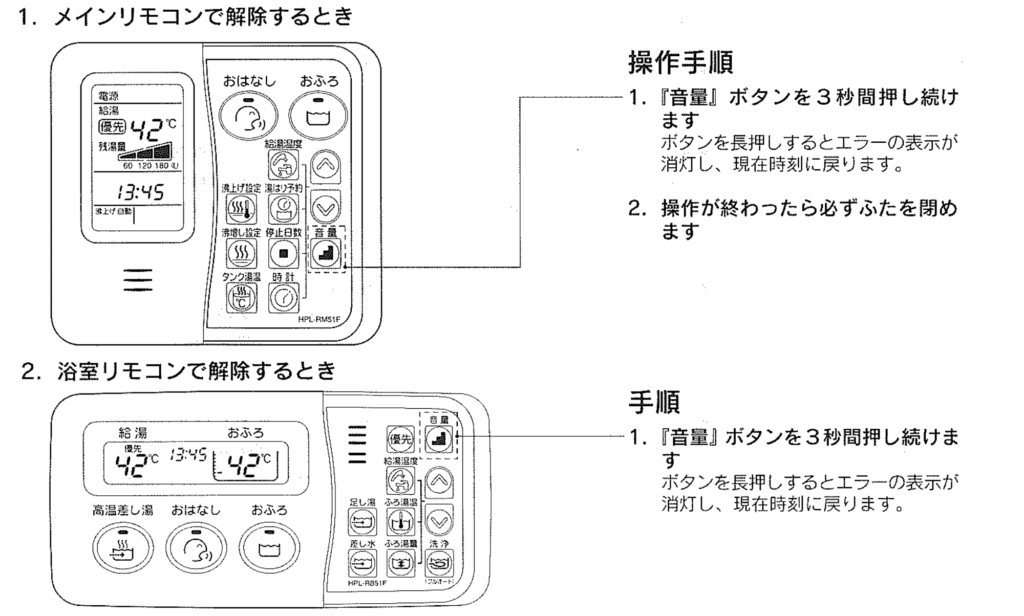 なお、品番HPL-2TFB372RAUの電気温水器であれば、以下の手順でエラー解除ができます。
