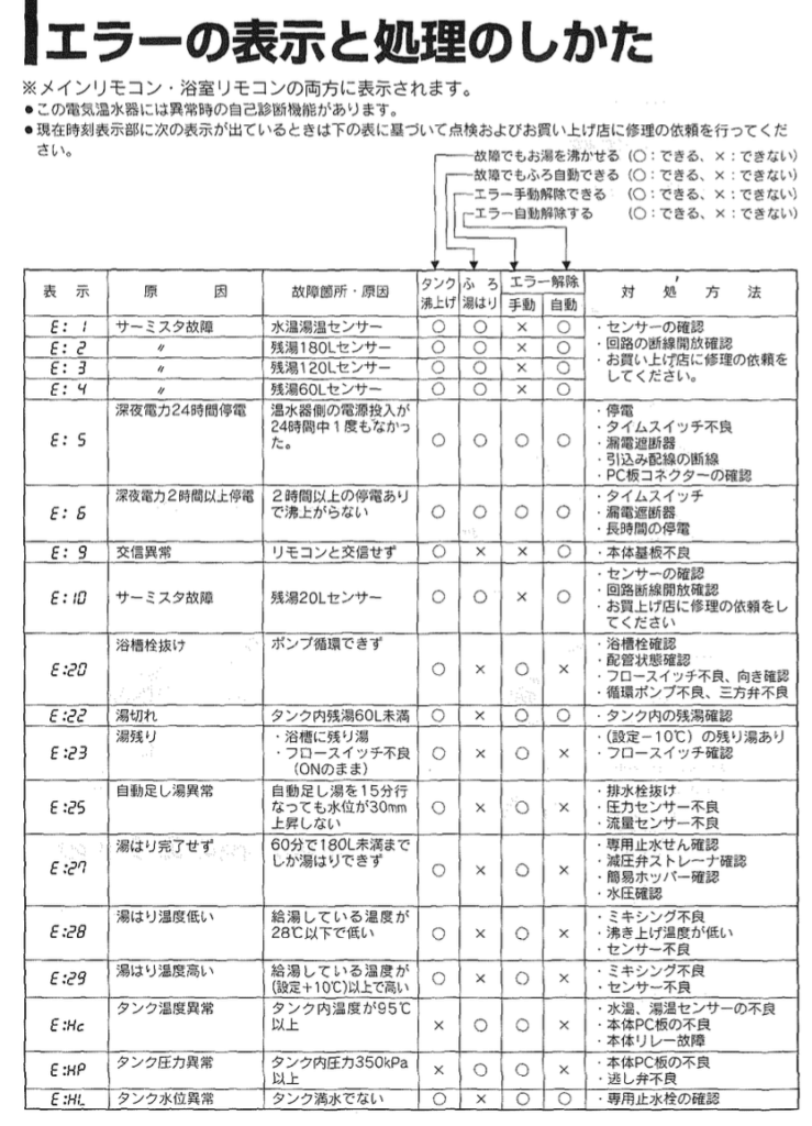 例えば、品番HPL-2TFB372RAUの電気温水器であれば、取扱説明書に以下のように「エラー解除:手動 ◯」と表記されています。