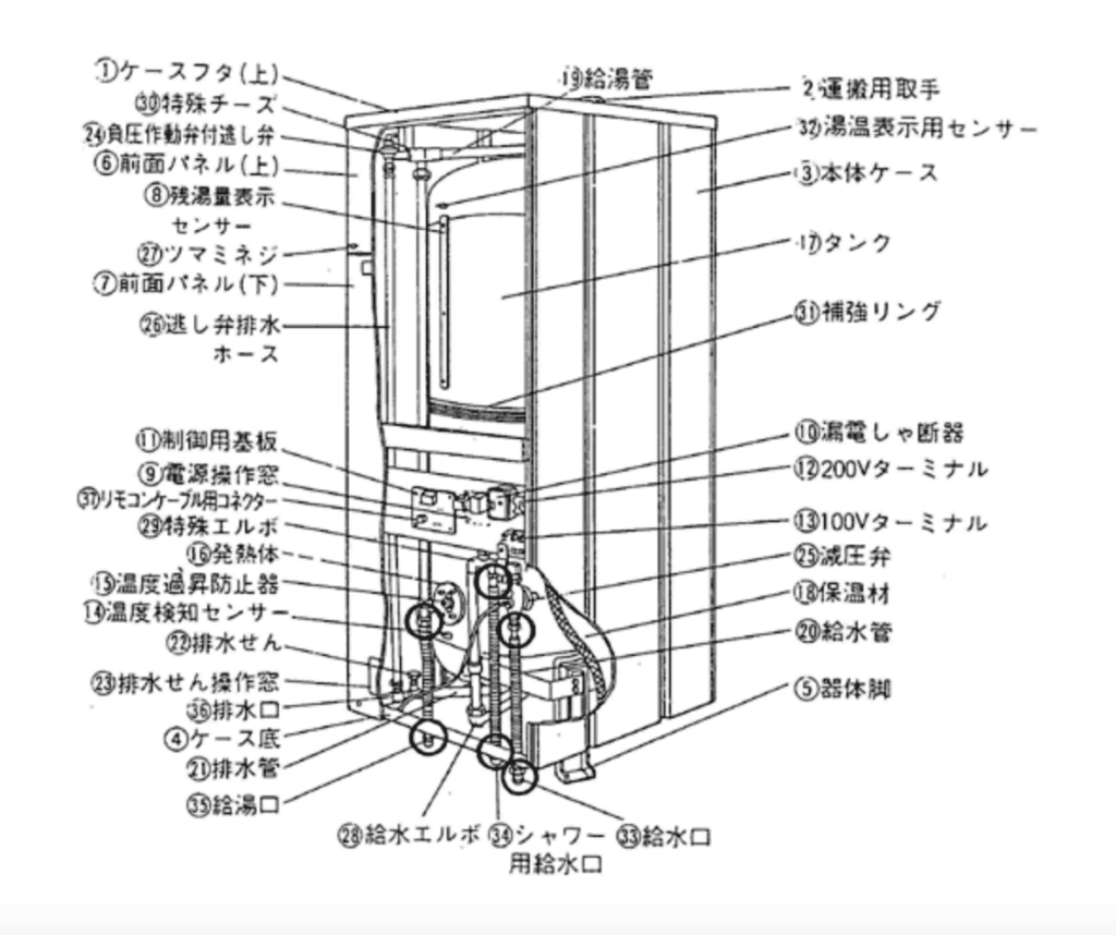 実際にみてみるとイメージが湧くと思うので紹介すると、下図は三菱製の電気温水器の構造例です。(日立ではありません)